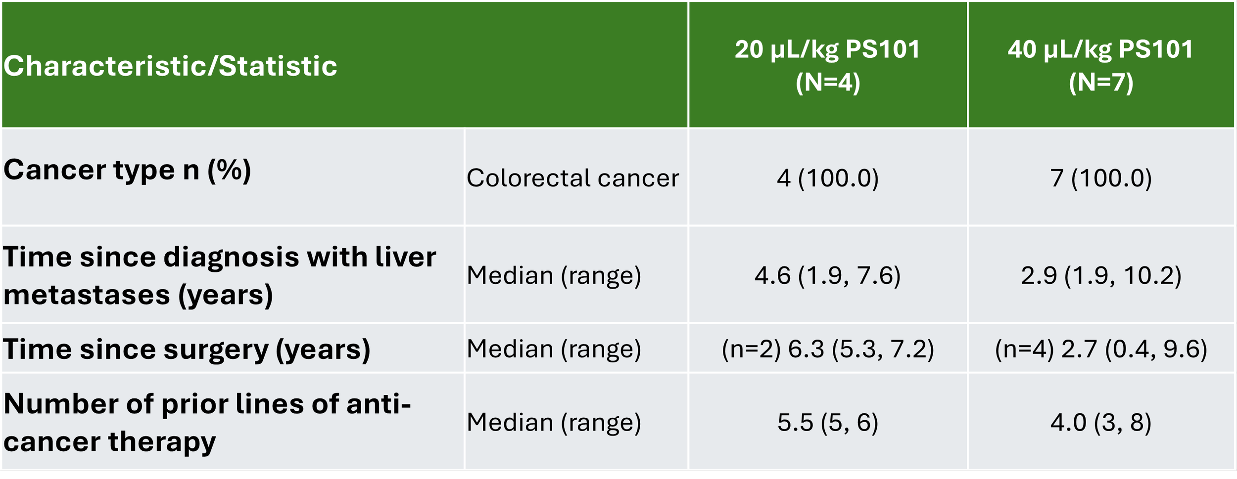 In the patients who had a response to chemotherapy, tumours treated with ACT showed a statistically significant greater shrinkage and 4-fold shrinkage compared to chemotherapy alone in the same individuals (−29% vs. −7%, p<0.05). Tumour shrinkage was seen in 6 out of 9 evaluable patients who received ACT with chemotherapy. PS101 was safe and well tolerated when given with chemotherapy.